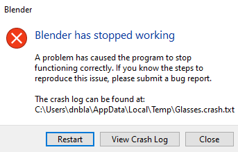 Report 1 Description: "Blender crashes when closing program" — steps: open, close via cross.