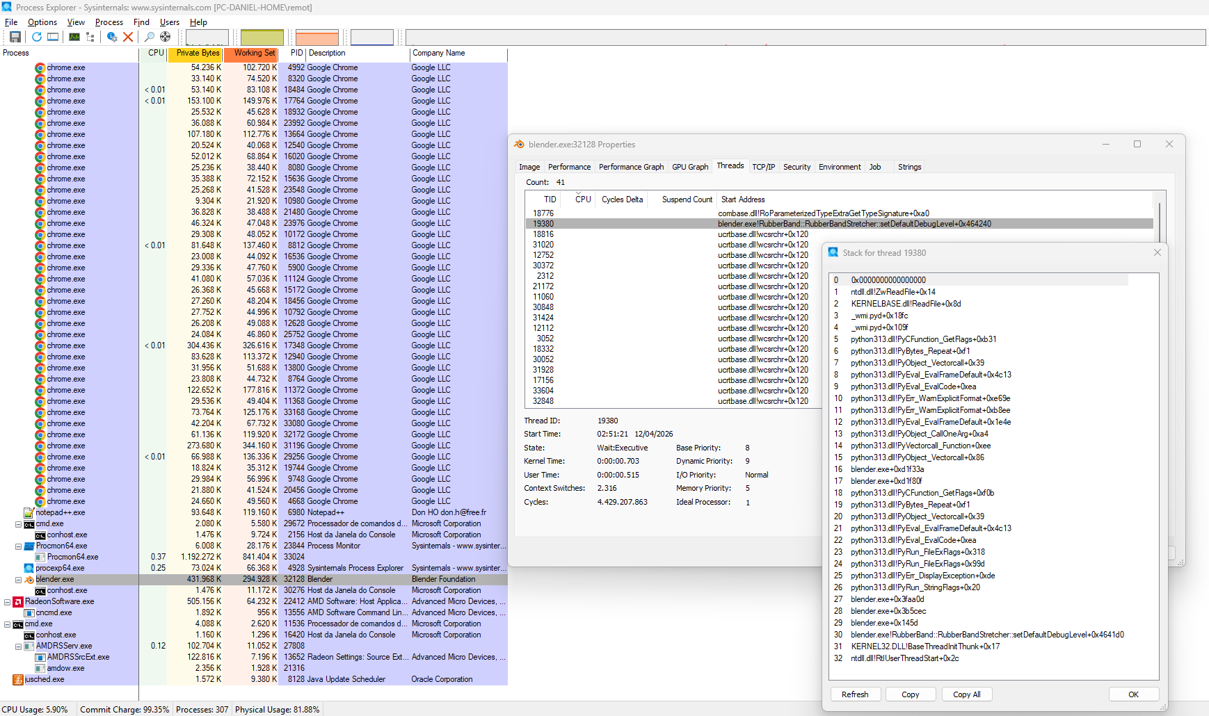 The active thread shows Python execution involving WMI:
