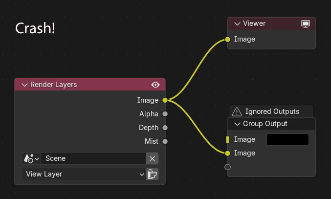 Blender will crash if the user attempts to render when the Image output of a Render Layers node is connected to both a Viewer node and a Group Output node, but only if the image is connected to anything other than the Group Output's first Image item. This happens in both Cycles and Eevee. There are various combinations that don't cause a crash (e.g. if the Viewer node isn't connected at all). It needs connections to both the Viewer node and to the Group Output's 2nd, 3rd, or 4th (etc.) input, just not the first Image item.