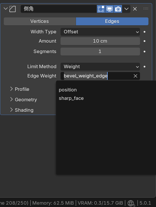 In version 5.1.0, when using the bevel modifier, the properties cannot be found if beveling with weights; however, in version 5.0.1, the properties are available.